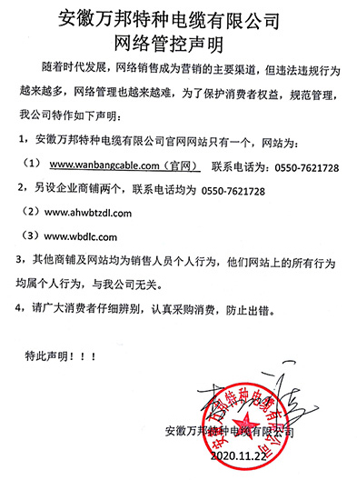 鄭重聲明:安徽萬邦特種電纜有限公司官方網站為:www_wanbangcable_com.zhong888.cn,除此之外無任何子網站或合作網站,其余均為假冒偽劣。電話:0550-7621728 13485756353 地 址:安徽省天長市滁州高新技術產業開發區經四路29號